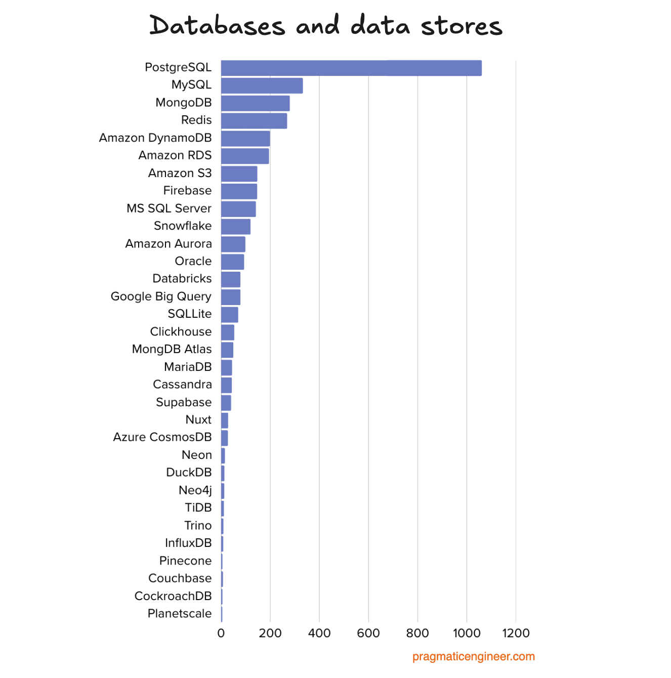 Databases and data stores. PostgreSQL is the leading choice for databases, and there’s a very long tail of database solutions which professionals choose.