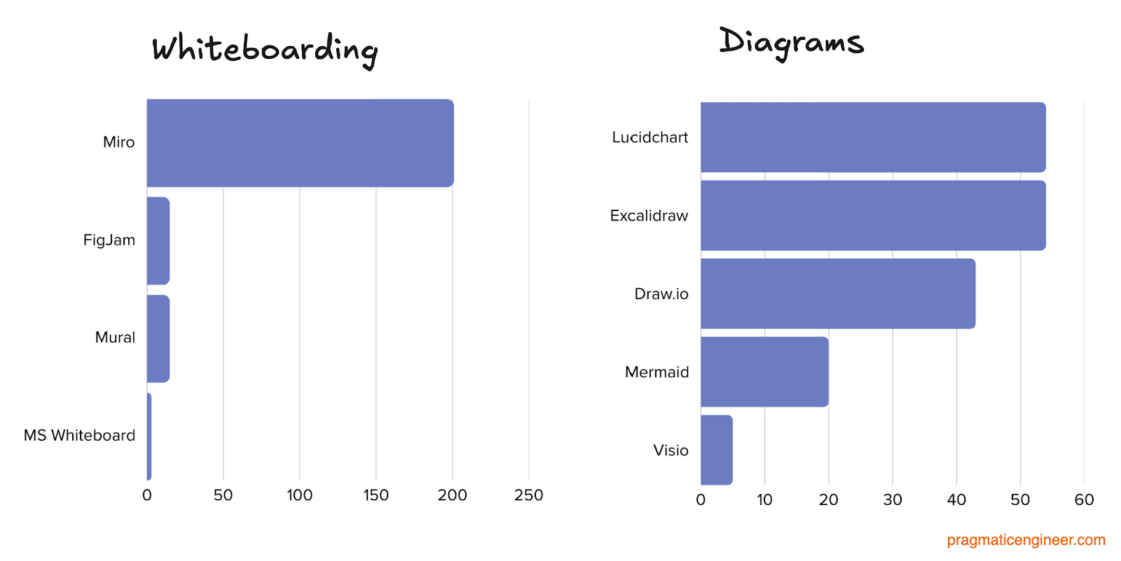 For creating diagrams, Lucidchart, Excalidraw, and Draw.io are equally popular, while there are honorary mentions for Mermaid (which renders Markdown into diagrams) and Microsoft’s Visio.