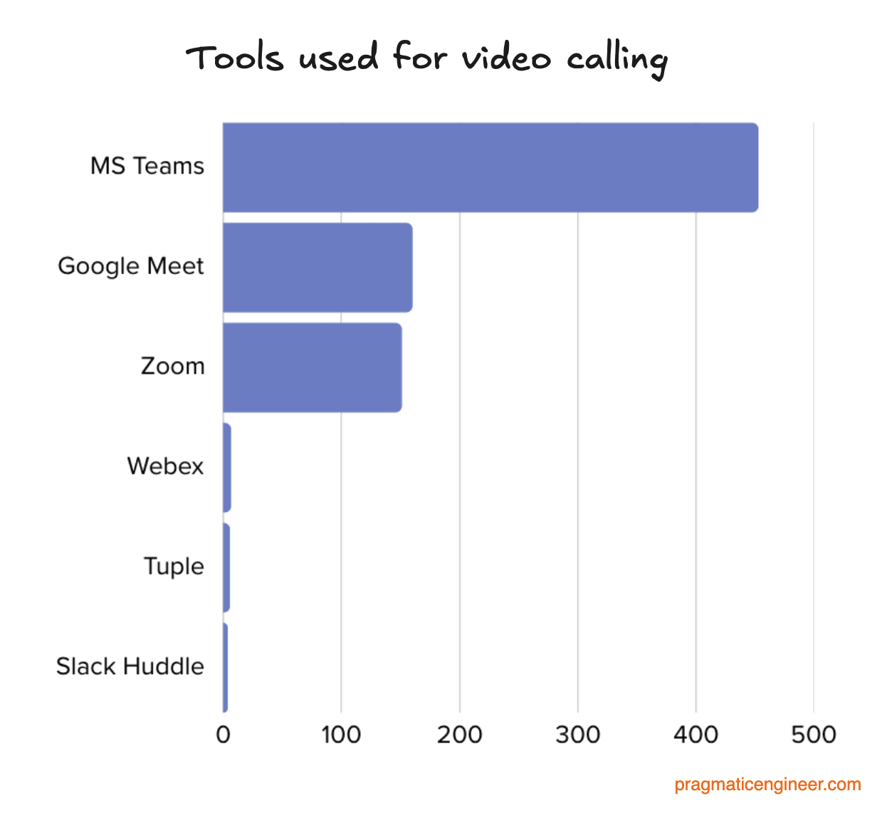Comparison in this category is a little tricky because MS Teams is a chat and video calling tool, while Google Meet and Zoom are solely for video calls. Other mentions include Cisco’s Webex, Tuple (a remote pair programming tool), and Slack Huddle (multi-person screen sharing, a feature inside Slack)