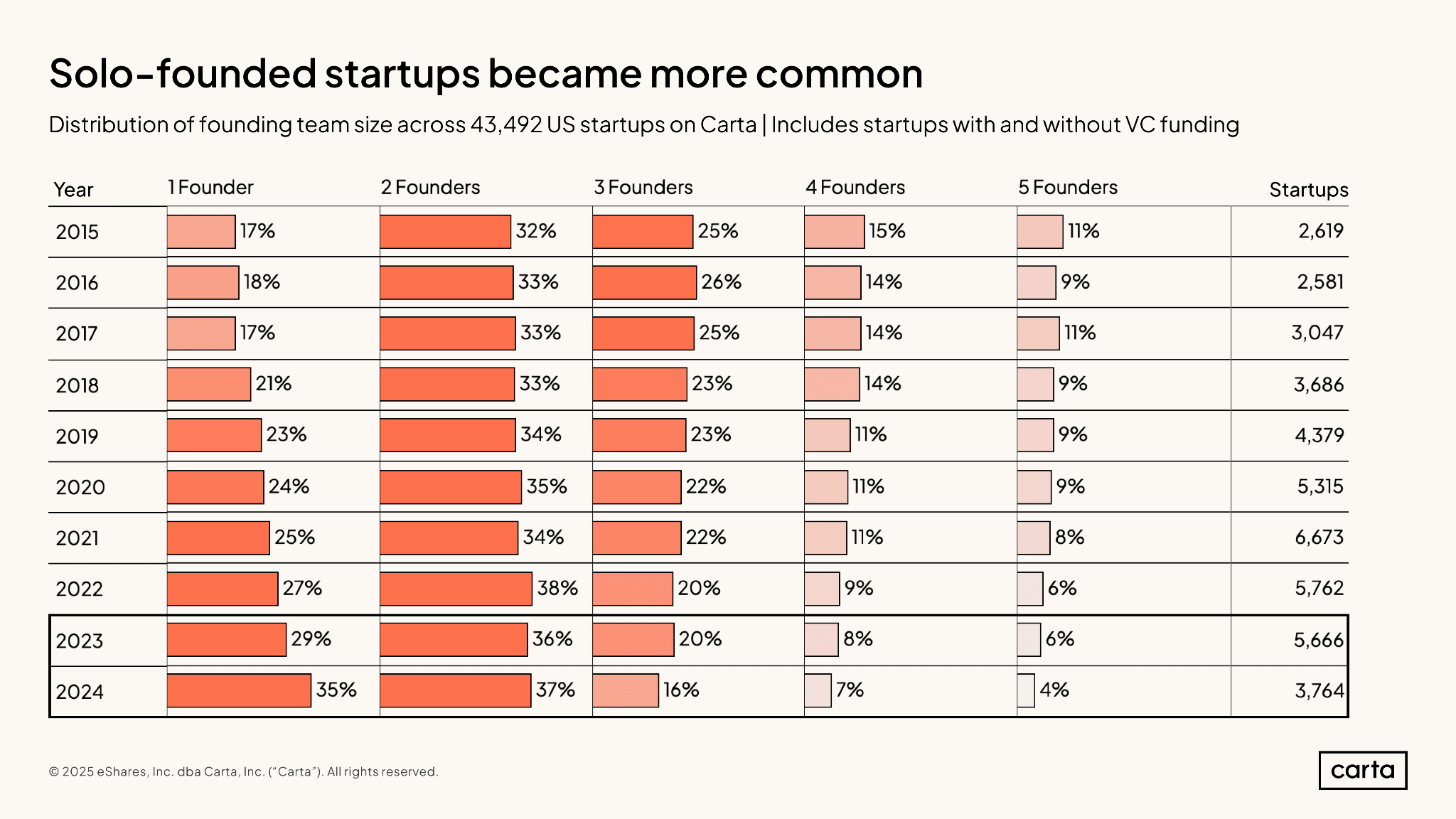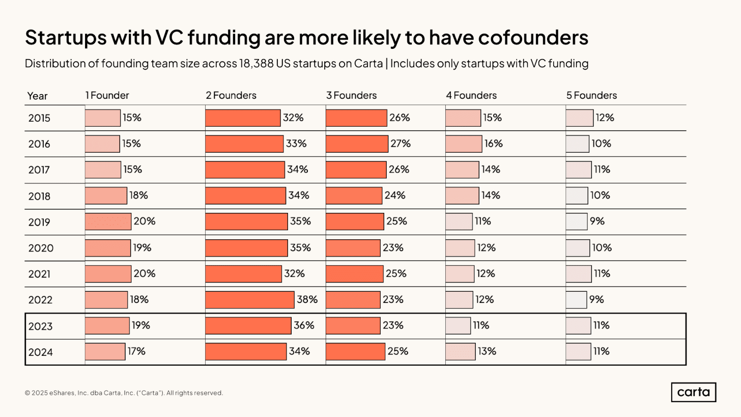 Amusingly, despite more startups having one founder, VCs do not back more of these solo founder startups: