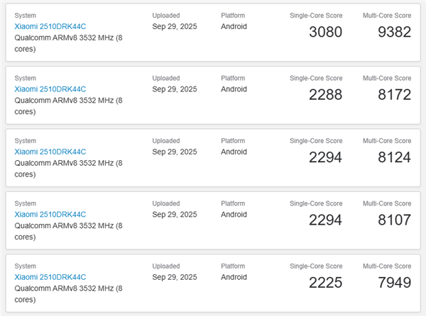 快科技9月30日消息,近日,一款型号为“2510DRK44C”的小米手机跑分现身GeekBench数据库。