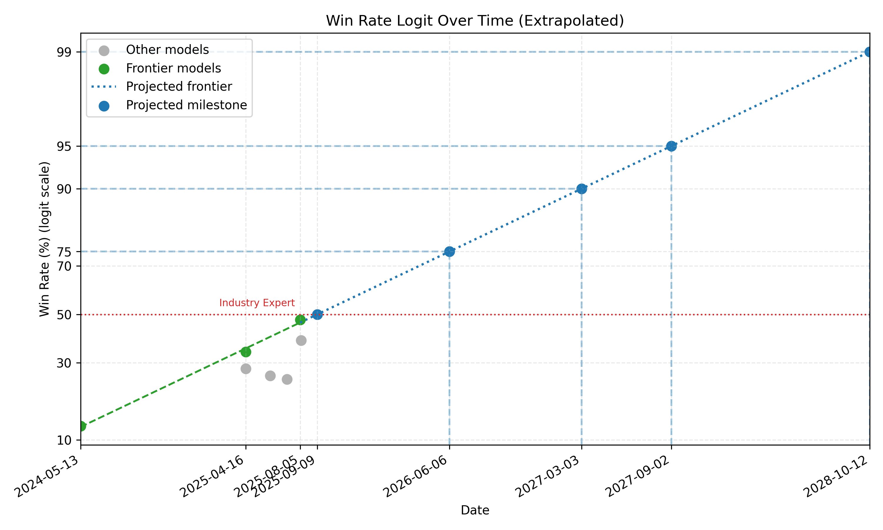 Under this regression, a hypothetical model release today would have already outperformed an industry expert in an average task in GDPval. By mid-2026, human experts would prefer AI deliverables 75% of the time. By late-2027, human experts would prefer AI deliverables 95% of the time.