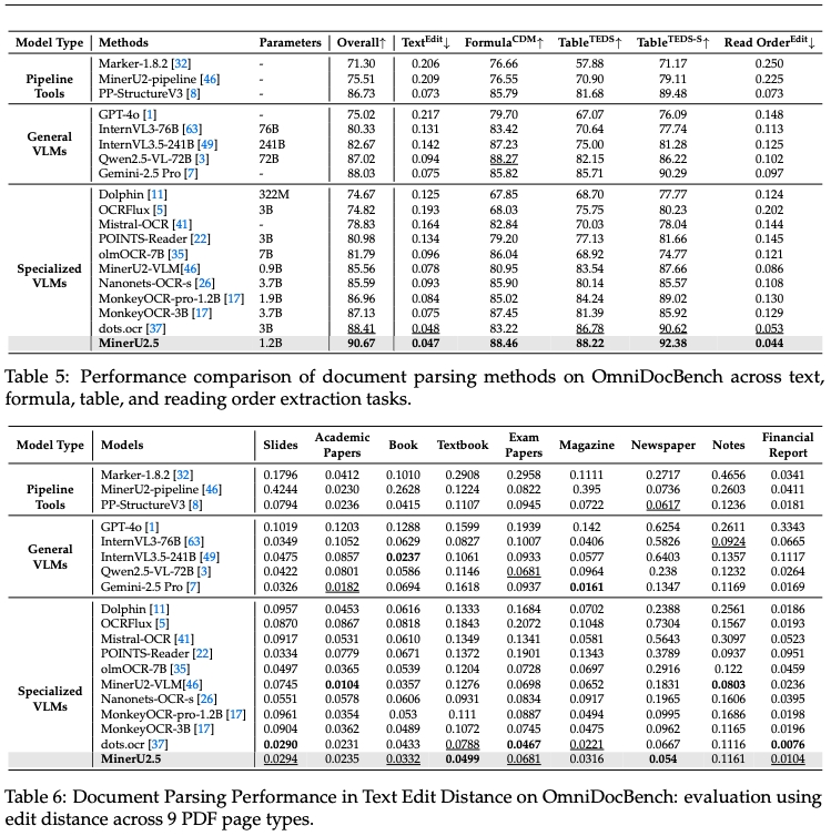 在解析效率方面,MinerU2.5采用了QwenVL2系列的原生分辨率视觉编码器(675M)及0.5B的语言解码器,模型总参数量接近1.2B。