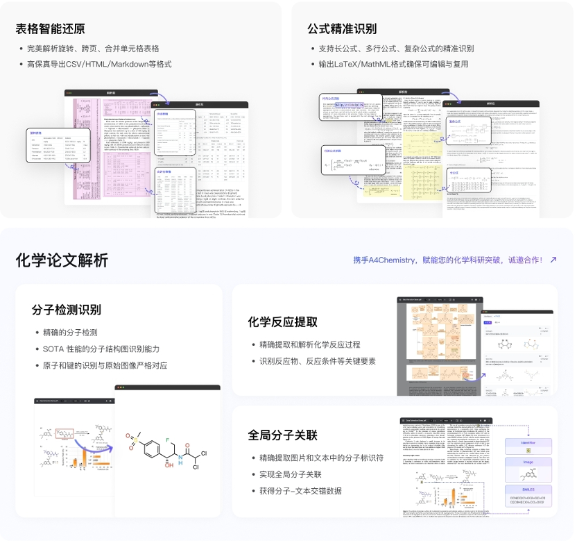 本次迭代新增了表格旋转识别、无线或少线表格解析、跨格式文档无损复制以及参考文献识别等功能,并对中文公式、复杂数学公式以及嵌套表格的解析精度进行了优化。