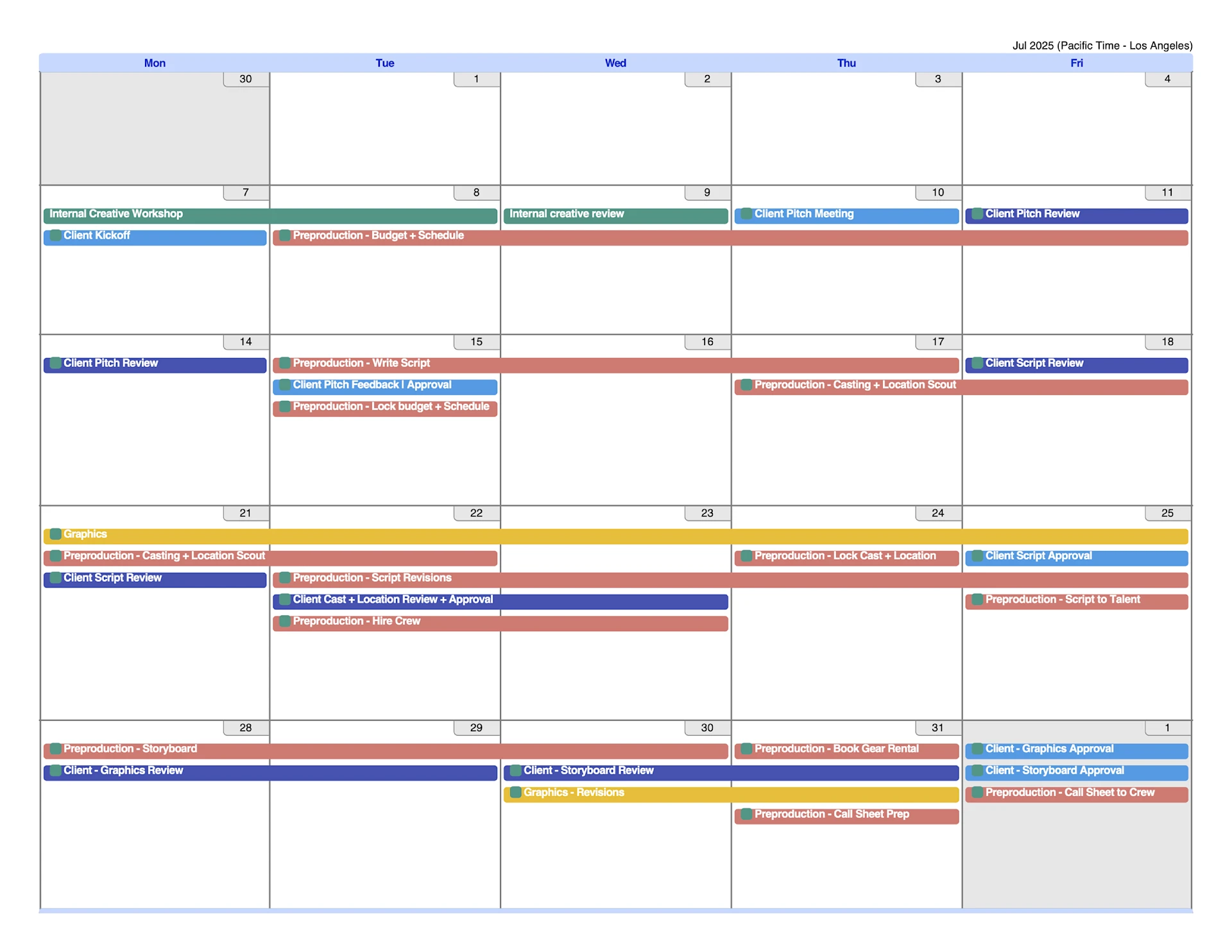 使用 Google 日历、Monday.com、Microsoft Excel、PowerPoint 或任何基于可视化的日历应用程序(并导出为 PDF),准备一份完整的生产计划,直观地显示项目生命周期的所有阶段,从 7 月 7 日的启动电话会议开始,到 8 月 29 日的最终交付结束。