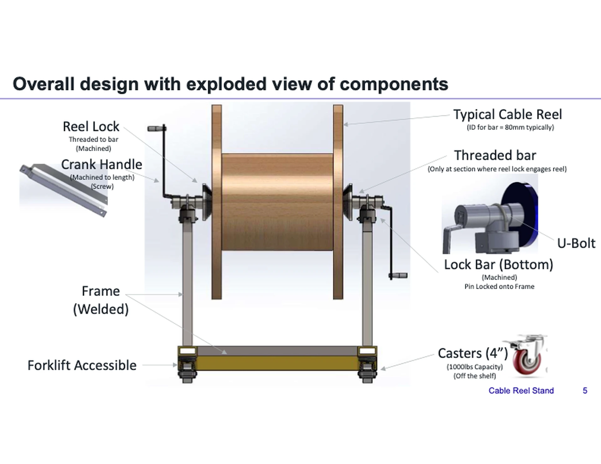 这是 2025 年 6 月,您是汽车装配线的一名制造工程师。该产品是用于地下采矿作业的电缆绕线车,您正在查看最终测试步骤。在最后的测试步骤中,需要将一大卷电缆卷入和卷出 2 次,以确保电缆卷轴按要求工作。目前的作需要 2 人进行此测试。第一个人需要将线轴带到测试单元附近并放置,第二个人将电缆线轴的开口端连接到测试单元并逐步启动卷轴。当电缆从线轴上解开并放到卡车上时,第一个人需要旋转线轴以方便展开。当电缆完全卷到卡车上时,下一步是以相反的顺序执行作,以便电缆从卡车中卷出并回到自己的卷轴上。此测试将再次进行以确保功能。这项任务复杂,存在相关风险,需要大量劳动力并使工作区域变得混乱。您的经理要求您开发一种夹具/夹具,以简化电缆卷筒线轴的卷入和卷出,以便测试可以由一个人完成。此请求附有一份信息文档,其中提供了有关电缆卷筒尺寸的基本详细信息、设计电缆卷筒夹具和构建可交付成果的信息。这项任务的可交付成果将只是初步概念设计。将执行单独的任务来计算设计基础,例如应力、强度、成本效益分析等。使用 3D 建模软件设计夹具,并使用 Microsoft PowerPoint 创建演示文稿。作为可交付成果的一部分,仅上传一个总结设计的 pdf 文档,使用创建的 3D 设计的快照。提交不需要 3D 设计文件。
