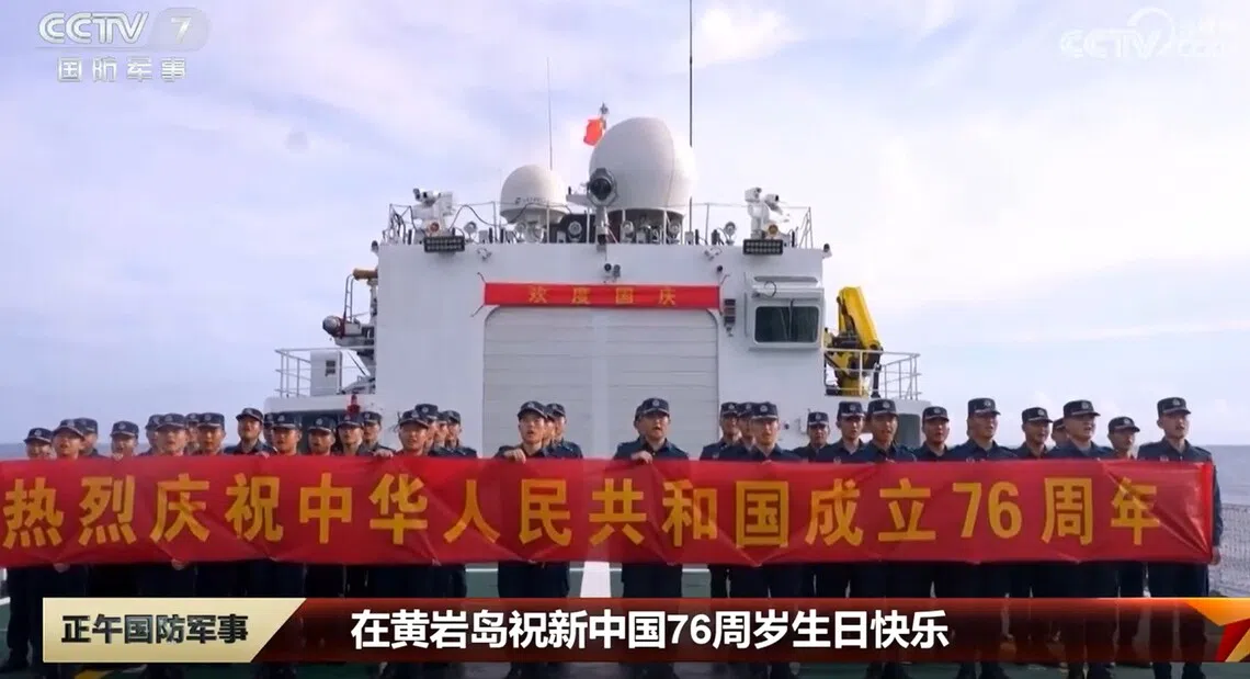 中国海警星期三(10月1日)发布段视频画面,显示中国海警船在有主权争议的南中国海黄岩岛(菲律宾称斯卡伯勒浅滩)海域举行国庆升旗仪式。 (央视视频截图)中国海警星期三(10月1日)发布段视频画面,显示中国海警船在有主权争议的南中国海黄岩岛(菲律宾称斯卡伯勒浅滩)海域举行国庆升旗仪式。
