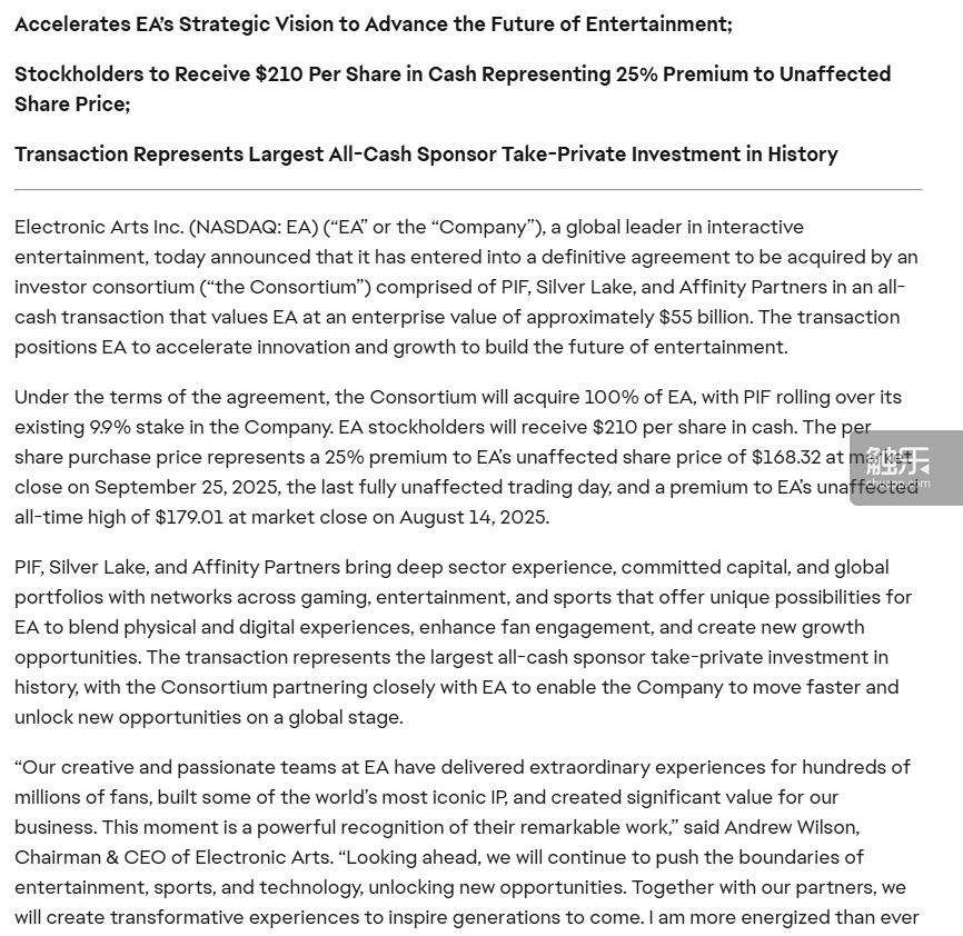 EA发布的新闻稿原文