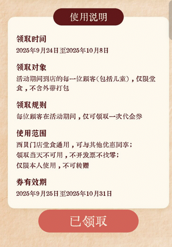 为了吸引顾客,西贝在9月24日起推出“西贝请您吃饭”,面向全部顾客发放100元堂食代金券。