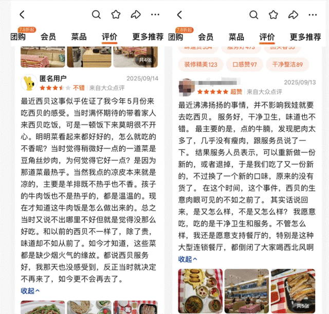 另一位用户则表示,“最近西贝这事似乎佐证了我今年5月份来吃西贝的感受......明明菜看起来都好好的,怎么就吃的不香呢?都说西贝服务好,我那天也没感受到,反正当时就决定不再来了,如今更不会再去了。”