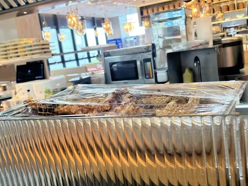 不久,从大后厨方向走来一位员工,拿着一盒肉酱,像是刚出锅,还热气腾腾的,对于现在怎么保存,他和儿童餐区的员工讨论了起来,最后他们决定,“得等放凉了,再冷藏”。说完两人拿出塑料薄膜,将放肉酱的餐盒裹了起来。