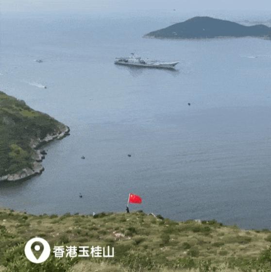 是山东舰航母编队访港时香港市民在山顶举起五星红旗挥舞相迎