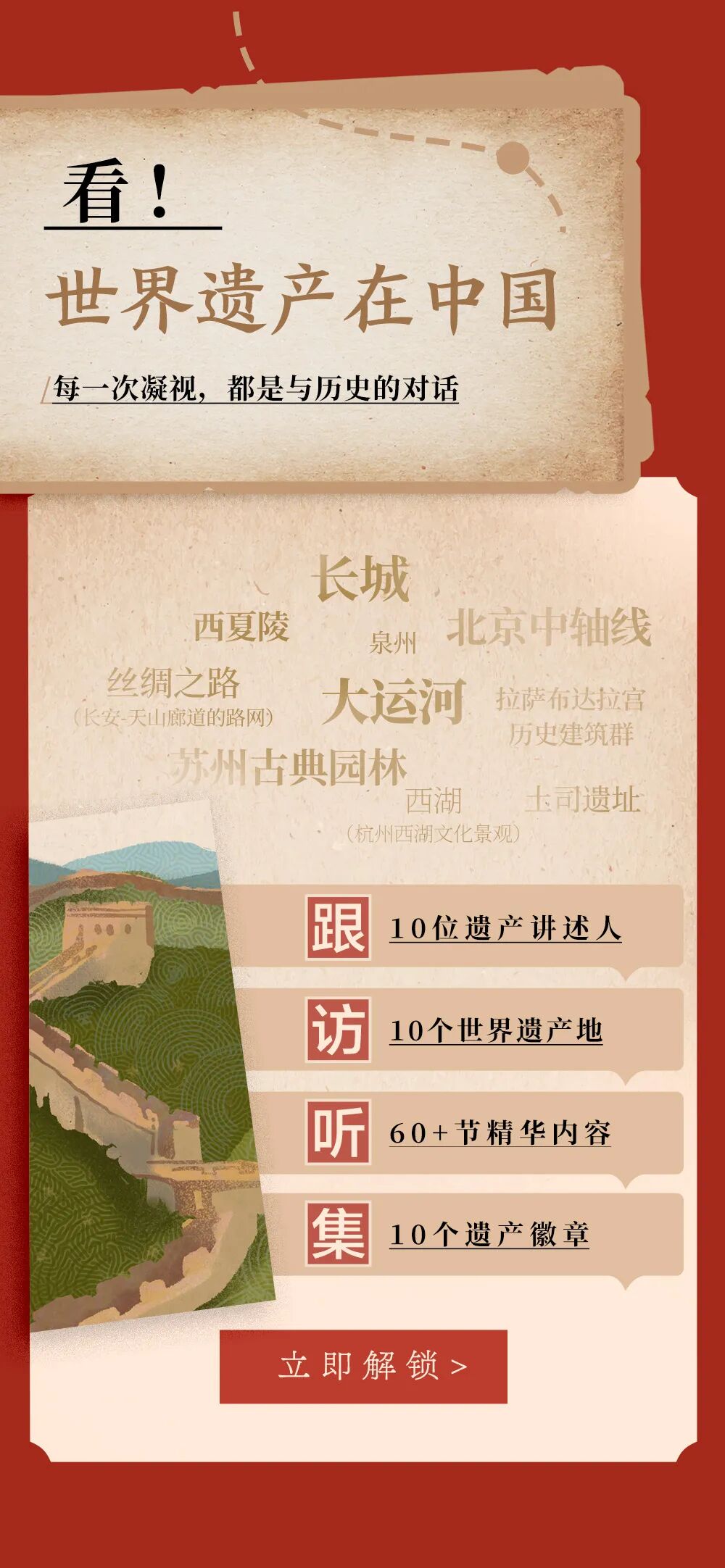 在探索世界文化遗产的路上,7位相关领域学者,会带你前往西夏陵、中轴线、长城、丝绸之路、大运河、布达拉宫、土司遗址、苏州古典园林、西湖文化景观、泉州等10大世界遗产地,拾起不为人知的历史与文明。