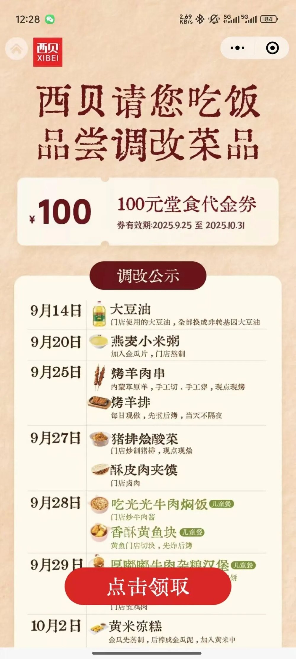 调改后,店员会给所有到店的顾客出示一个二维码,扫码后会弹出一个“西贝请您吃饭 品尝调改菜品”的页面。调改公示显示,西贝自9月14日从换非转基因大豆油开始,陆续于9月20日、9月25日、9月27日、9月28日、10月2日完成对燕麦小米粥、烤羊肉串、烤羊排、香酥黄鱼块、黄米凉糕等等菜品的制作流程调改,最后派发一张100元的优惠券。