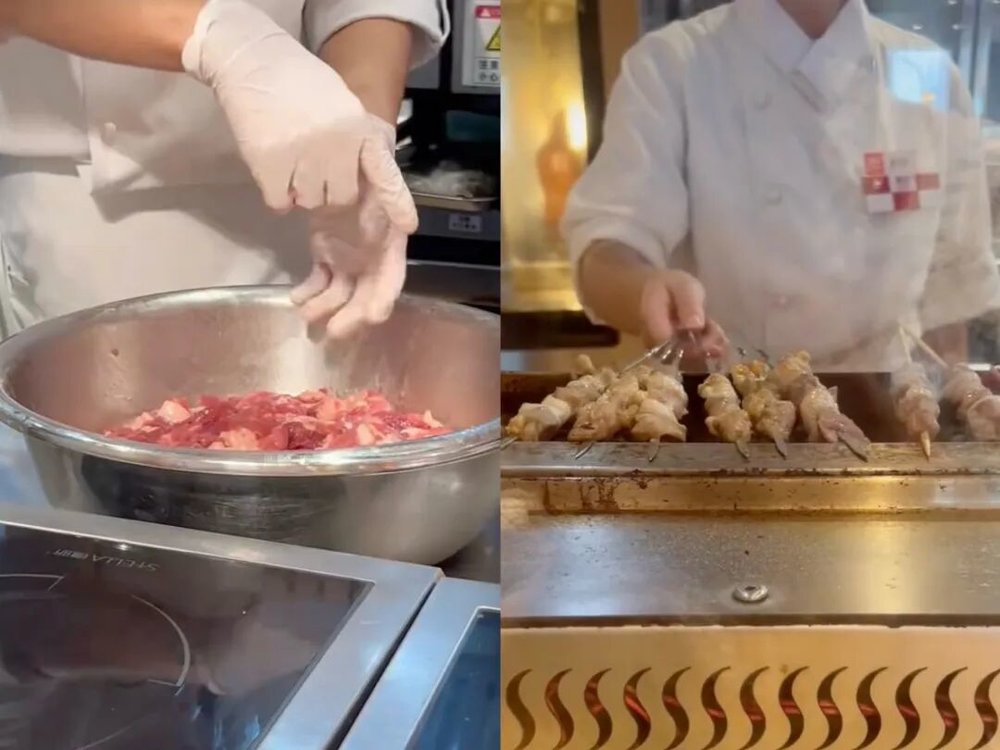 界面新闻在北京和上海的门店现场都看到后厨员工搅拌生羊肉原料的动作,店员介绍称,这是现穿羊肉串所需要的肉。另外,羊排、猪排、椒麻鸡、牛肉饼等门店现制环节通常在每天早上进行。
