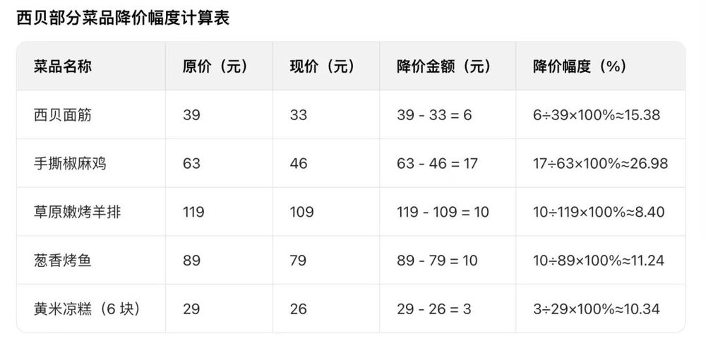 照此计算,西贝的部分菜品降价幅度在8.4%-26.9%之间。