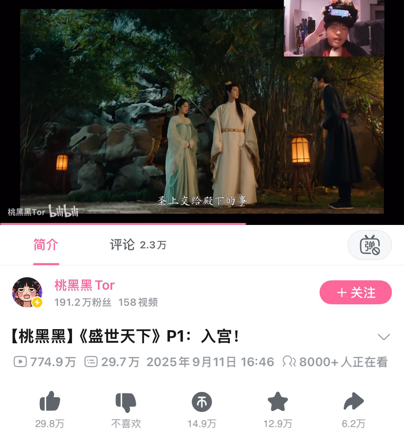 在发行策略上,影游同样借鉴了影视行业的成熟经验,尤其注重通过直播和短视频实现快速破圈。据惊蛰研究所观察,在B站平台上,逍遥散人、某幻君、桃黑黑等头部游戏UP主对《盛世天下》进行的视频切片和直播内容表现极为突出,部分单集视频播放量达到百万甚至千万级别。即便在游戏上线2周后,桃黑黑的《盛世天下》直播回放仍能吸引超过8000人同时在线观看,足见其内容的长尾吸引力。