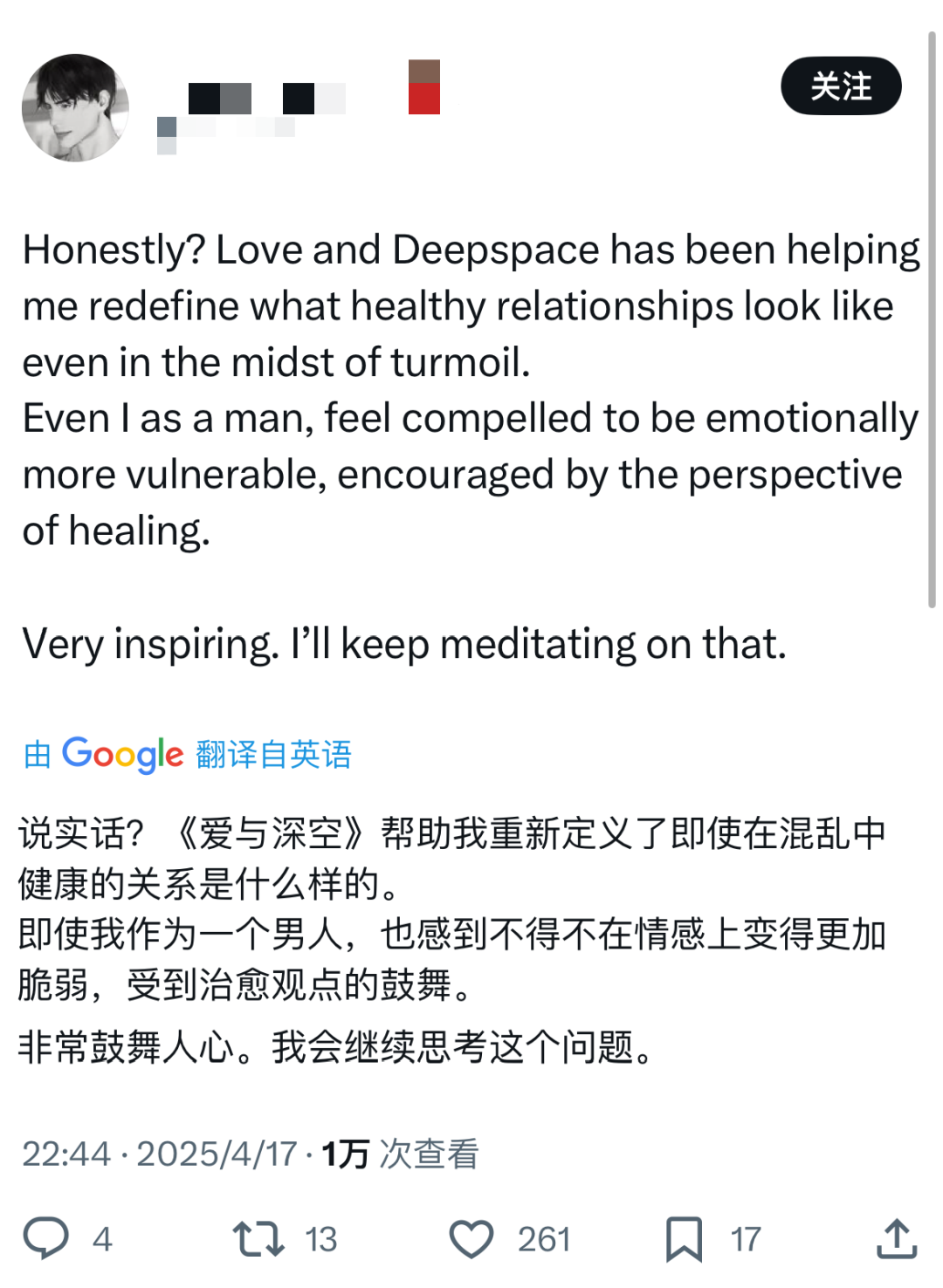 《恋与深空》能够获得广泛认可的原因,不仅在于有在“女人通常把男人分为四种类型”短视频挑战里火遍全球的五个男人,或许更在于它对于亲密关系的描绘,超越了文化和地域,甚至性别的隔阂。全球女性玩家,都在为“五个中国男人”心甘情愿地氪金,甚至将他们的照片放入国籍测试软件,想要将其纳入自己的国籍。
