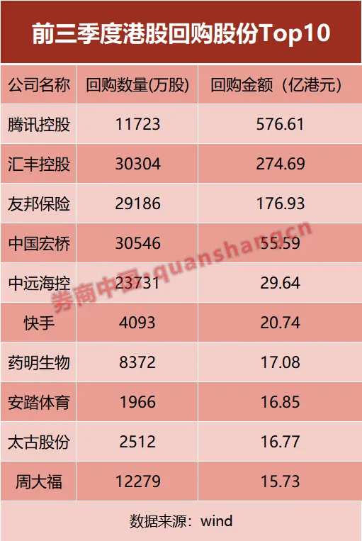 去年前三季度,超百亿港元回购的上市公司共有4家,分别为腾讯、汇丰控股、美团和友邦保险,回购金额分别为882.63亿港元、328.44亿港元和281.58亿港元和241.87亿港元。