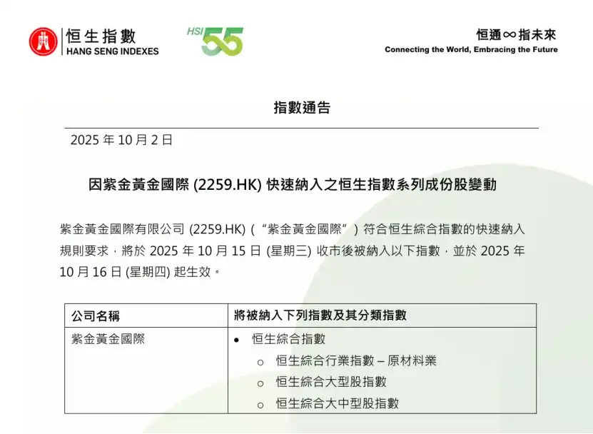 10月2日,恒生指数公司发布公告:紫金黄金国际(2259.HK)符合恒生综合指数的快速纳入规则要求,将于2025年10月15日(星期三)收市后被纳入以下指数,并于2025年10月16日(星期四)起生效。