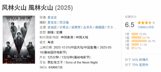 2025年10月2日,电影风林火山的豆瓣评分正式开放,截至当前,该片评分为6.5分。评分分布显示,15.5%的观众给予五星评价,23.7%打出了四星,36.7%选择了三星,另有17.3%给出两星,6.7%的观众打出一星差评。