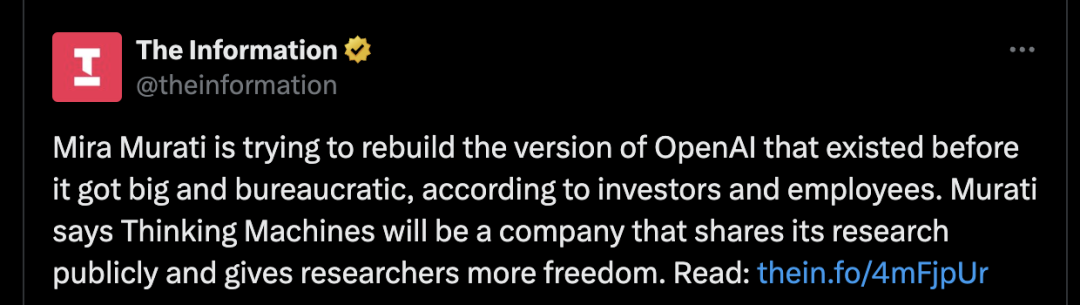 与此同时,还有消息称Thinking Machines Lab正在尝试“重新发明一个OpenAI”,重建OpenAI在规模变大、变的官僚主义之前的那个版本。
