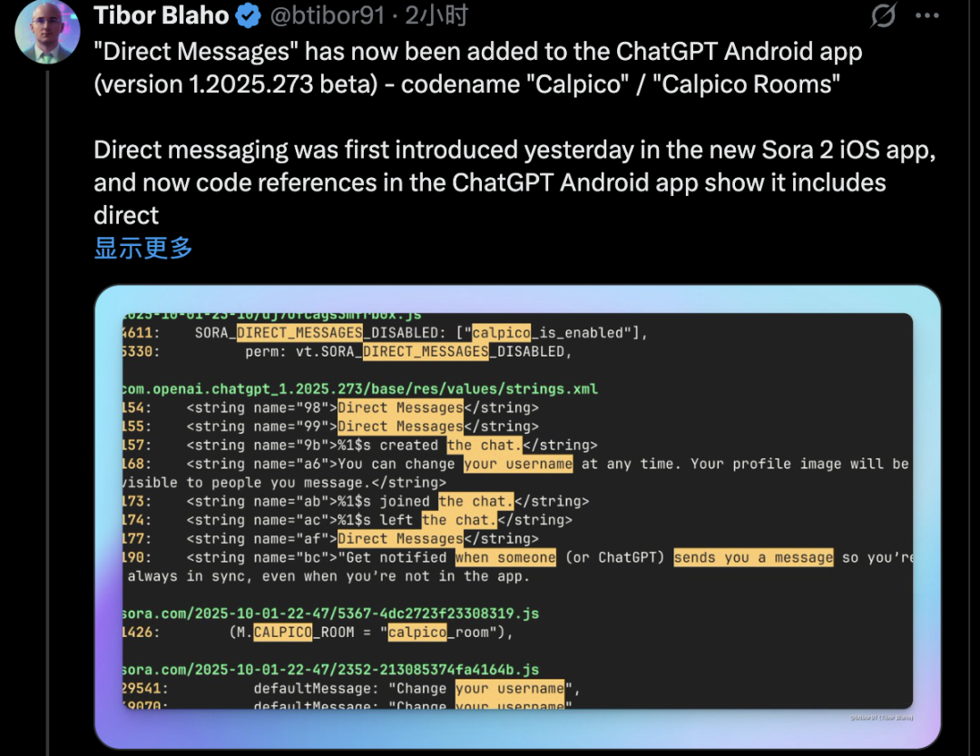 除了Sora 2驱动的“AI抖音”之外,ChatGPT的APP代码中也被扒出要搞“社交模式”。