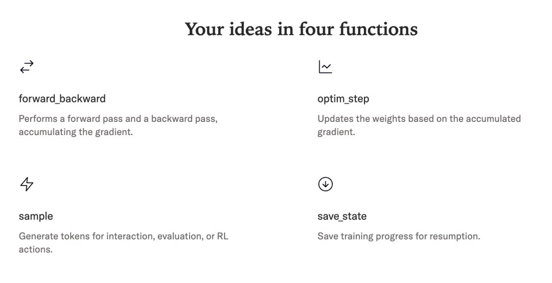 Thinker的API提供了forward_backward和sample这样的底层训练步骤,同时仍自动处理调度、扩展和错误恢复。