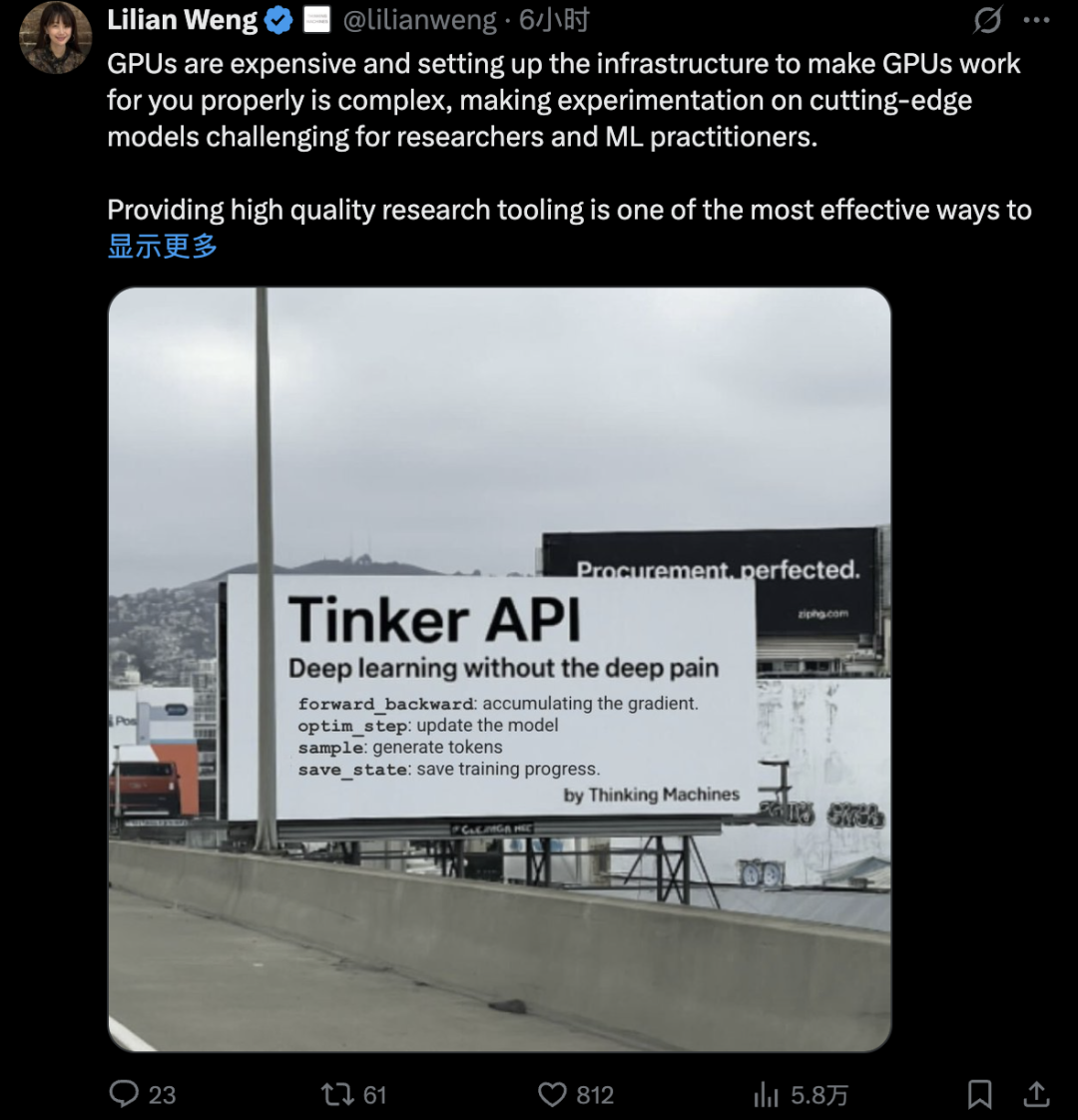 联合创始人翁荔表示:GPU价格昂贵,并且设置基础设施非常复杂,使研究人员和从业者使用前沿模型进行具有挑战性,Tinker是提供高质量的研究工具、提高研究生产力的第一步。