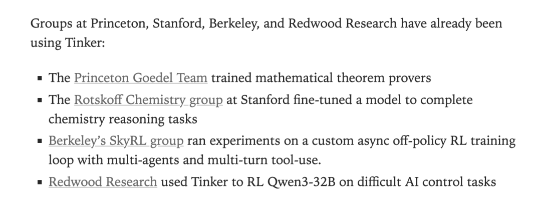 来自普林斯顿、斯坦福、伯克利和Redwood Research的研究团队则已经用Tinker搞出不少成果。