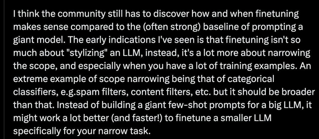 从早期迹象看,微调不只是给大模型的输出换个风格,更多是缩小任务范围。特别是当你有训练样本数量很大时,与其给大模型构建复杂的few-shot prompt,不如直接微调一个小模型专门处理特定任务。