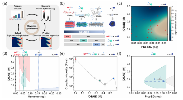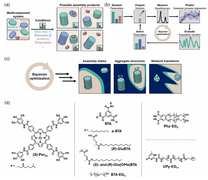 在超分子体系中,多组分通过非共价相互作用协同自组装,实现单一组分无法实现的功能。但是非共价相互作用的多样性,使得多组分分子体系的设计空间高度复杂,传统基于机制的模型难以准确推导与优化。相比之下,贝叶斯优化(BO)能够在有限实验条件下高效探索高维参数空间,因而为快速发现和定制功能性超分子体系提供了有力工具。