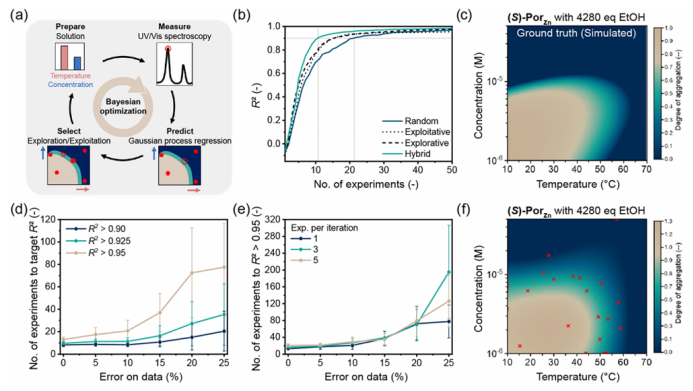 作者利用BO研究了上述体系组装状态随温度和浓度的变化。所采用的 BO 框架包含迭代步骤:(1) 使用高斯过程回归(GPR)基于已有采样数据预测组装能景;(2) 通过采集函数选择新的采样点;(3) 使用质量平衡模型模拟所选数据点。作者应用了探索型(选择预测不确定性最大的点,增加知识)、利用型(选择预测值最大的点,追求局部最优)和混合型(在探索与利用之间平衡)采集函数,通过跟踪 GPR 预测与模型真实值的 R²评估性能。结果表明,BO 框架无论使用哪种采集函数,其表现均优于随机采样,而混合型采集函数性能最佳。作者模拟了人工数据误差,评估BO的稳健性。结果显示,当目标是更高预测精度时,数据准确性的重要性显著增加;在实验误差较高时,则应采用小批量实验以最小化所需实验总数。接着作者实验验证BO,实验采样点聚焦于单体-聚合物转变区域,构建的组装能景已与质量平衡模型预测的能景高度相似(R² = 0.86)。(图2)