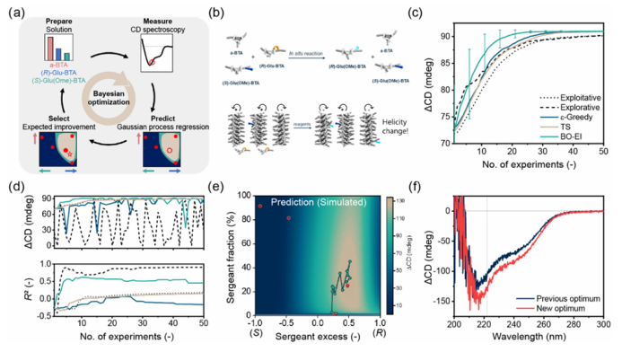 接下来,作者验证了BO在超分子体系实现目标性能优化的功能。作者研究了由三种共组装的苯-1,3,5-三甲酰胺(BTA)单体组成的手性超分子体系。手性谷氨酸BTA(Glu-BTA)可通过共价修饰转化为谷氨酸5-甲酯BTA(Glu(OMe)-BTA),从而改变共聚物的螺旋性。通过BO 调控初始 BTA 混合物配比,来增强螺旋性变化。作者在已建立的 BO 框架中引入了期望改进(EI)采集函数,结果表明 EI 函数比其他的采集函数更高效。随后作者实验验证了BO与模拟数据找到的最优组分,结果表明该体系的螺旋性变化明显高于先前报道中的最大值。(图3)