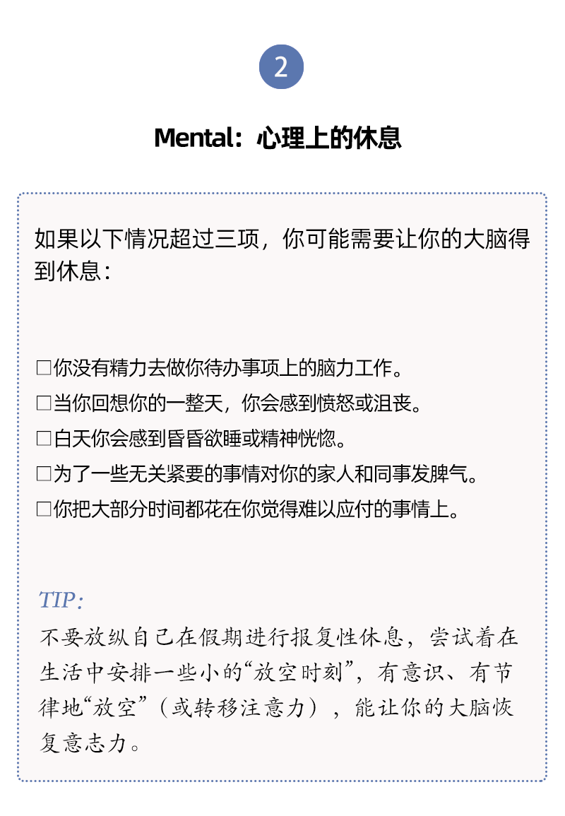 单靠某一个具体的假期、某一种具体的活动,并不能让我们恢复到完全休息好了的状态。