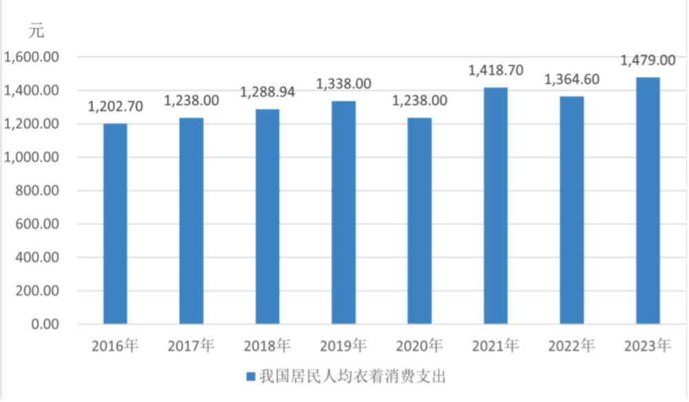 图一:我国居民人均衣着消费支出变化趋势。数据来源:国家统计局