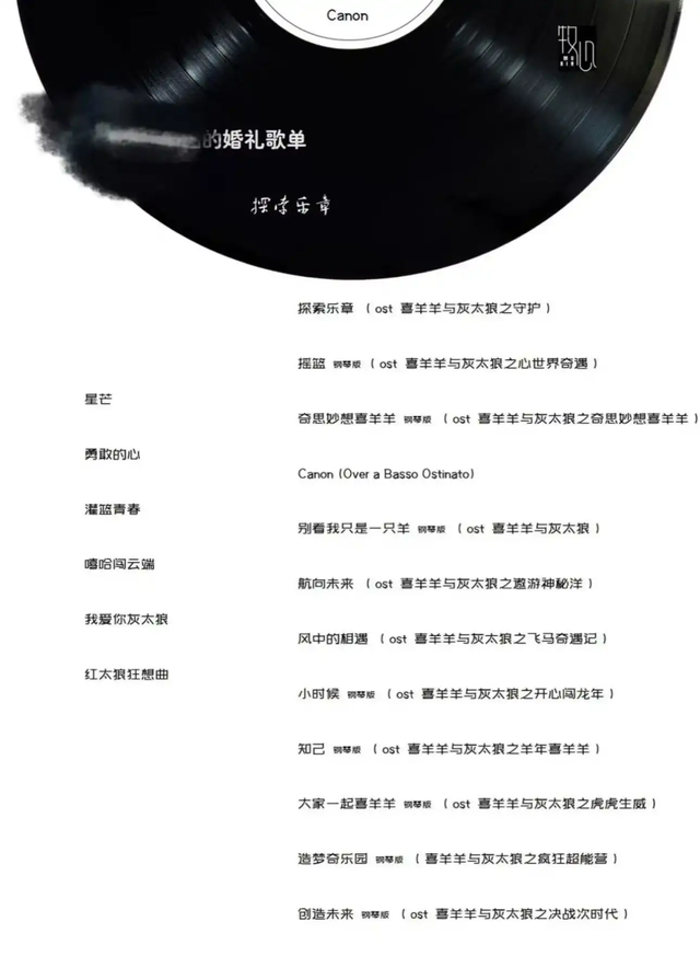 除了场地置景外,婚礼进行曲的歌单都是我亲自敲定的,里面的歌曲分别来自《喜羊羊与灰太狼》不同系列的插曲,如《别看我只是一只羊》《奇思妙想喜羊羊》《风中的相遇》《小时候》等等。