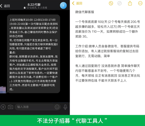 ⚖️ **法律责任与平台处置**:微信安全团队强调,参与任何形式的“代聊”行为已涉嫌帮助信息网络犯罪。平台将依据国家法律法规及用户协议,对违规账号采取阶梯式处置,直至永久限制登录。若用户明知他人从事违法犯罪活动仍协助,可能承担法律责任。