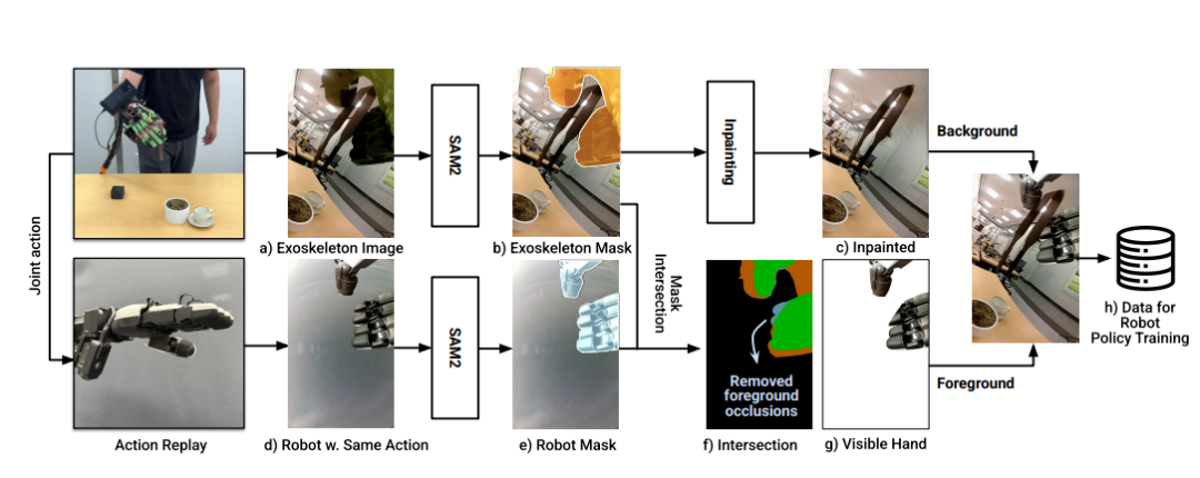 首先利用SAM2对观测视频中的人手及外骨骼进行分割(图4b)。由于SAM2需初始提示点,团队建立了标准化操作协议:操作者始终以相同手势开始演示,使得所有示教数据均可复用同一组提示点。