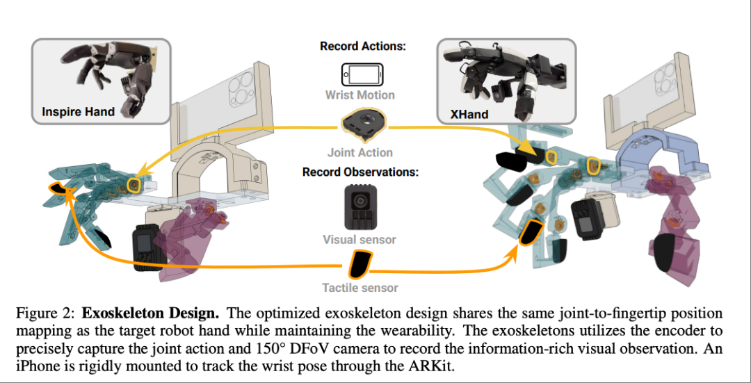 该装置采用编码器精准捕捉关节运动,配备150°广视场角相机记录视觉观测数据,并通过刚性连接的iPhone借助ARKit技术追踪手腕位姿。