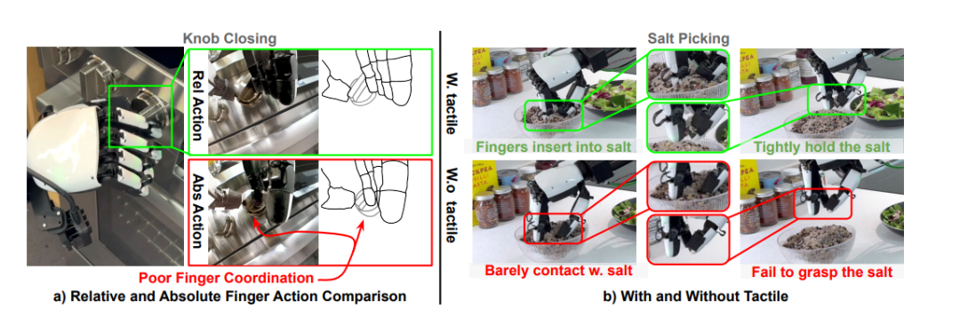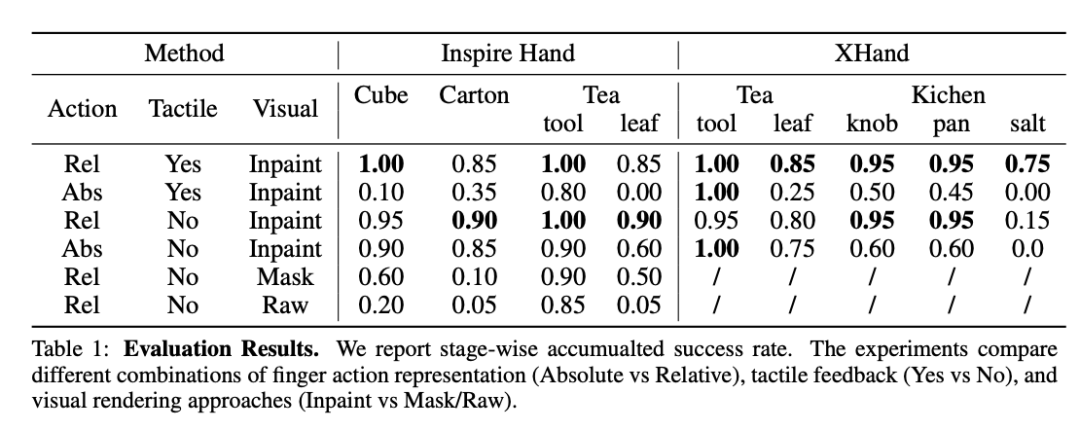 此外,星动XHAND 1单独完成了厨房长序列任务,该任务包括四个连续步骤:关闭stove旋钮、将锅从炉顶移到柜台、从容器中拿起盐、最后将其撒在锅中的食物上。该任务测试了DexUMI在具有精确动作、触觉传感和需要使用拇指和食指的侧面(而非指尖)的长周期任务上的能力。