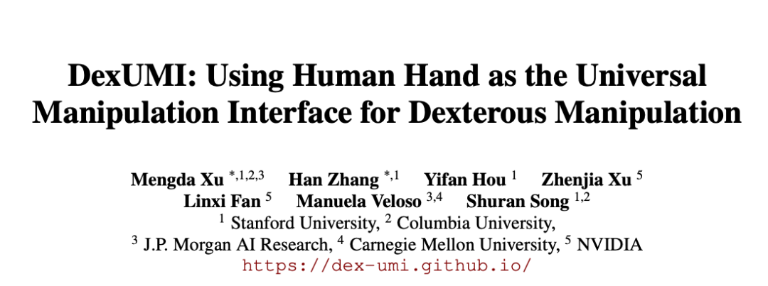 来自斯坦福大学、哥伦比亚大学、摩根大通AI研究院、卡耐基梅隆大学、英伟达提出了一种数据采集与策略学习框架DexUMI——