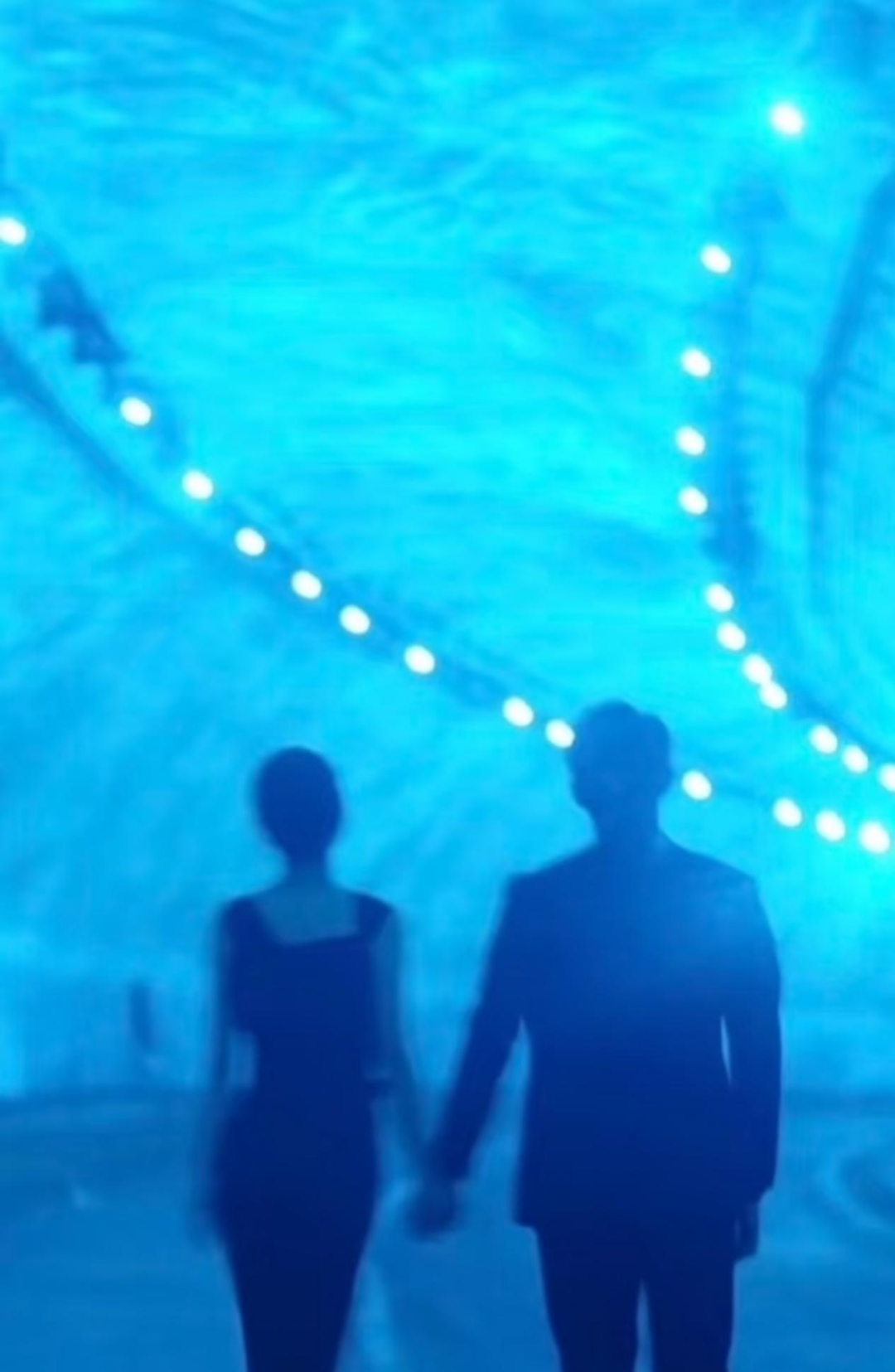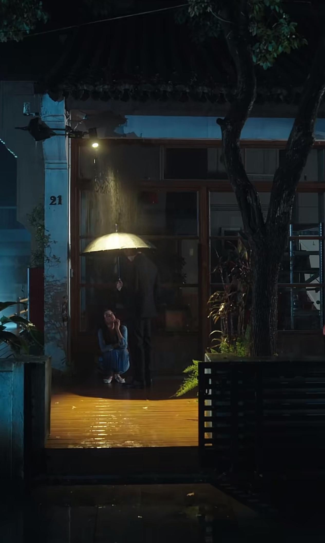 此外,漫长的蓝色隧道中二人并肩散步,冷调氛围更显暧昧;女主无助时,画面先切入一把为她撑伞的背影,而后才出现男主的脸——这种「尊重式关」的呈现方式,反而更拉近了两个人的距离。这些镜头不仅是美的,更直接参与了人物内心世界的构建。