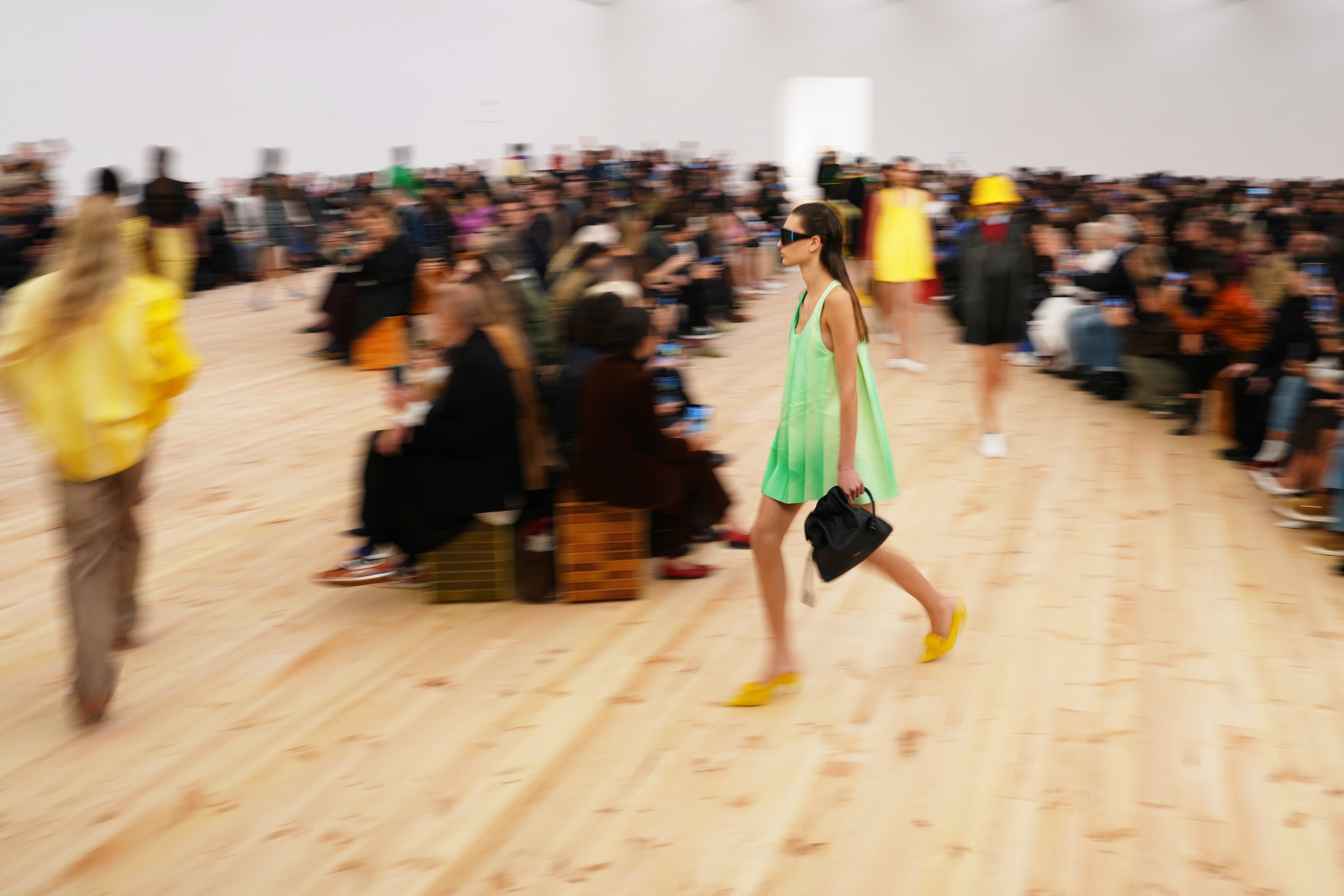 巴黎 2026 春夏时装周 Loewe 秀场,模特正在展示品牌新任创意总监 Jack McCollough 与 Lazaro Hernandez 的新一季时装作品。本季作品从运动服饰和美国艺术家 Ellsworth Kelly 的色域绘画中汲取灵感。设计师运用富有雕塑感的廓形和高饱和色彩构建视觉语言,通过精湛的皮革剪裁与模塑工艺,重新诠释了派克大衣、飞行员夹克、迷你连衣裙及 Polo 衫等经典单品,整体风格动感洋溢。摄影师:Aurelien Morissard