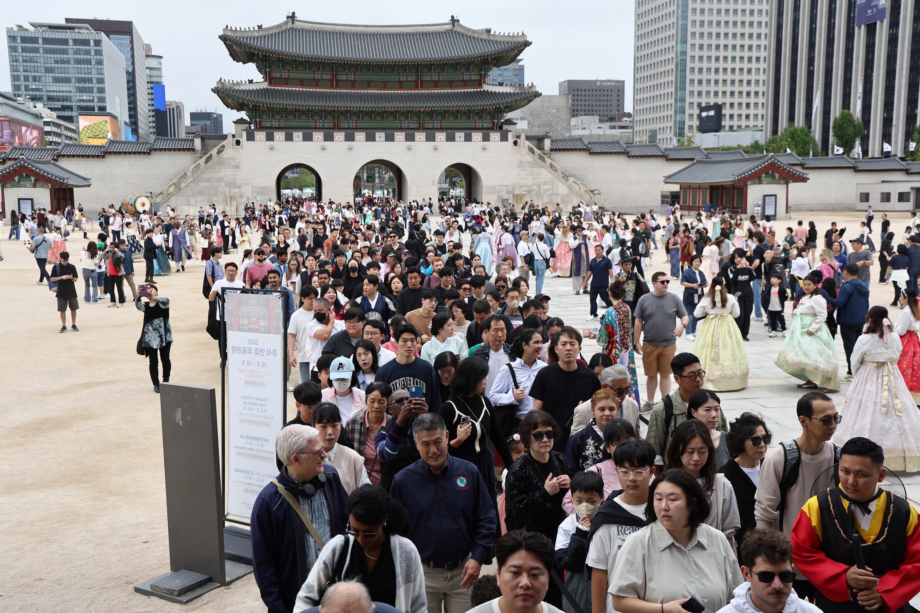 游客们在中秋假期游览首尔景福宫。10月3日,韩国首尔四大古宫景福宫、昌德宫、德寿宫、昌庆宫以及宗庙、朝鲜王陵等重要景点为庆祝中秋节免费向公众开放7天,并举办秋季宫廷文化节、宗庙人文音乐会等活动。韩国政府自9月29日开始对中国团体游客实行临时性入境免签政策,3人以上团体游客可免签入境韩国并停留15天,持续至2026年6月30日。韩国央行估计每100万人次中国游客将给韩国创造2.56万亿韩元旅游收入,拉动韩国 GDP 增长0.08个百分点。摄影师:iDaily Media