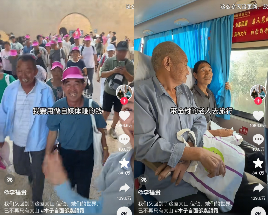 李福贵带全村老人旅游,源自她「用做自媒体赚的钱回馈社会」的愿望。平日里,当她拉着各种点心饼干、豆腐、蔬菜水果穿梭于各个乡村时,卖的货不仅便宜,还会在温情唠嗑中习惯性地给老人们抹去零头。