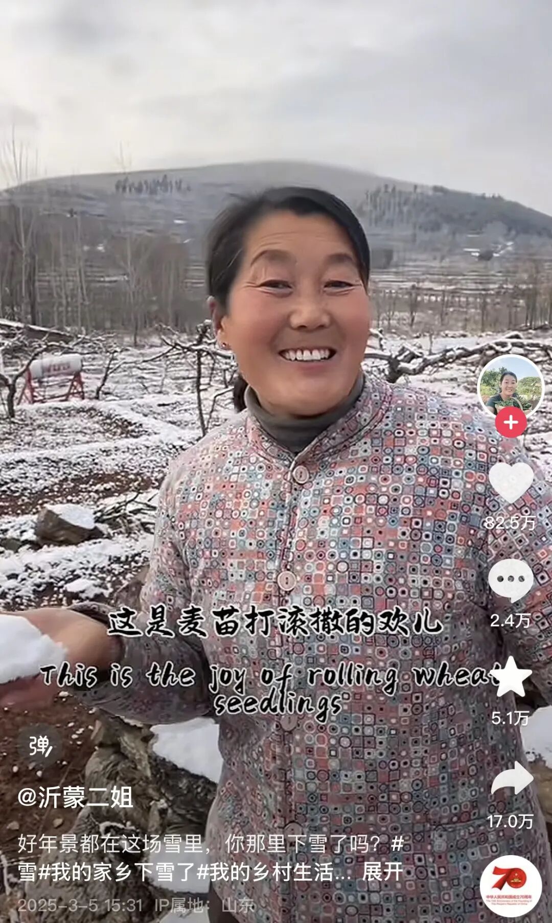 「这是雪吗?这不是雪,这是老天爷撒的糖霜盐,这是麦苗打滚撒的欢儿,这是老把式笑纹里淌出的农谚。这是雪吗?这不是雪,这是蓑衣汉子立田埂,钓起的三亩墒情,这是银梭子穿过针眼,给麦苗纳千层底的展现…」很多网友初识@沂蒙二姐,是从今年3月她以雪赋诗的这段视频开始的。