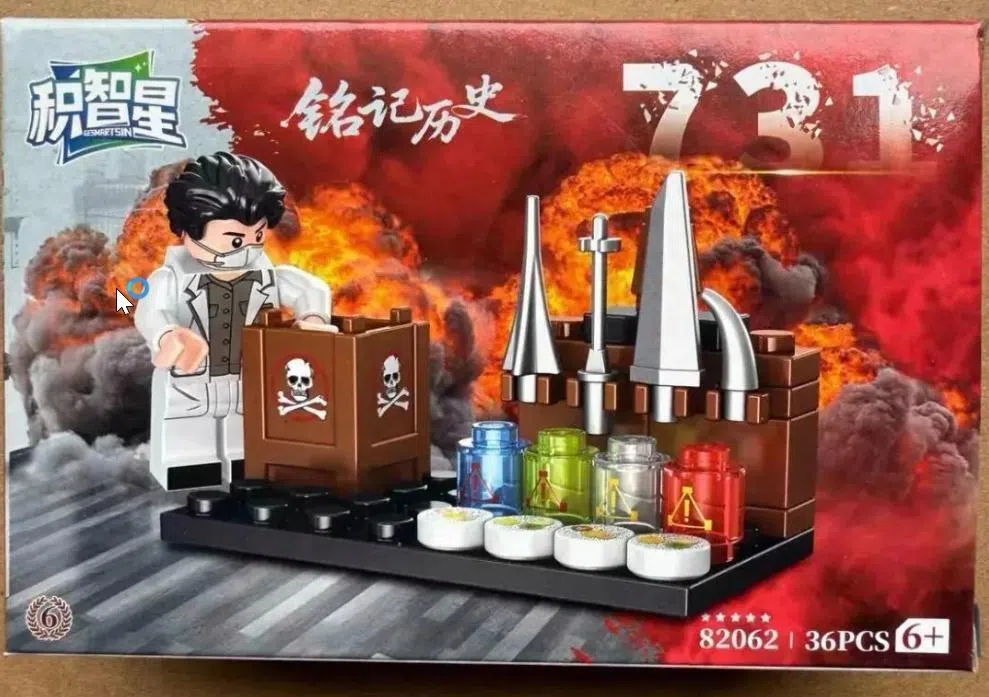 这款在购物平台淘宝上架的“731毒气实验室益智拼装积木”套装共有八盒,场景涵盖人体实验、生物制毒所、机枪扫射等。包装上还印着“铭记历史”“爱国教育情感启蒙”“军事主题历史还原”等字样,售价29.9元人民币(5.4新元)。
