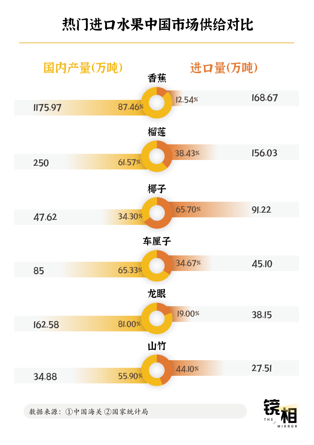 尽管中国的水果产量丰厚,但中国仍然是水果的净进口国,2024年进口量818.4万吨,是出口量的1.5倍。一方面,消费者想要吃到非当季的、多品种的水果;另一方面,水果卖家想延长销售期、减少耗损率,而进口水果商业化程度高,自然就成了两全其美的选择。如今,中国市场上的水果消费有7%依赖进口。