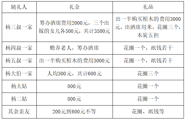 表1是杨三叔父亲去世后的丧葬礼单。
